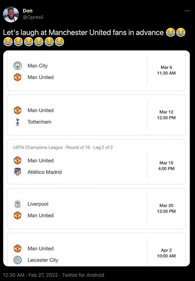 Setelah lawan Man City pekan ini, MU ditunggu Tottenham dan Atletico di bulan Maret. Sempat ada laga lawan Liverpool di tanggal 20, tapi kemudian akan dijadwal ulang. Foto: dok. Twitter