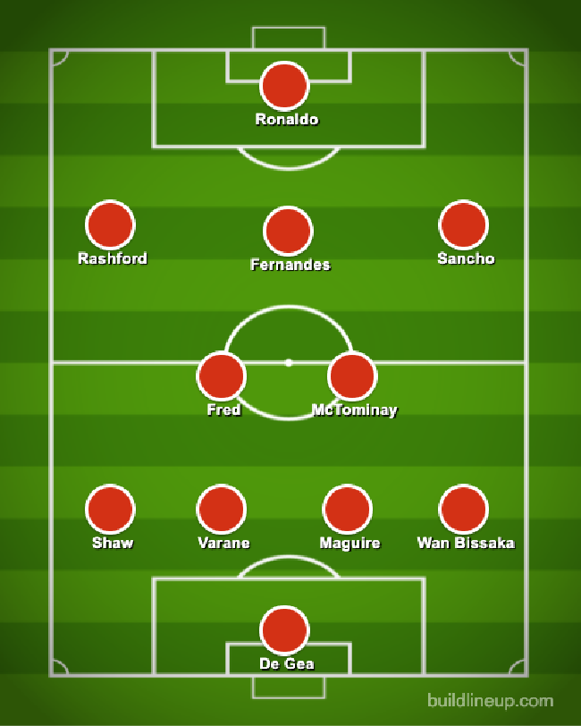 Ralf Rangnick bisa saja memainkan 4-2-3-1 dengan memasang McFred di depan kuartet pemain bertahan, demi meredam Man City. Foto: via Buildlineup