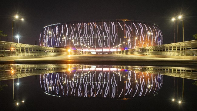 Jakarta - Meski pembangunannya belum rampung, kemegahan JIS sudah terlihat. Saat malam misalnya, stadion itu terlihat megah dengan lampu warna-warni yang mengelilinginya.