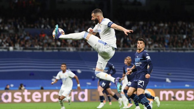 Ini adalah umpan cantik Benzema yang mengawali gol pertama Real Madrid ke gawang Man City. Foto: Getty Images/David Ramos