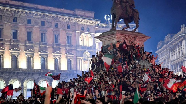Italia - Para suporter AC Milan memenuhi Piazza Duomo setelah tim kesayangannya mengamankan Scudetto. Ini menjadi Scudetto ke-19 bagi AC Milan.