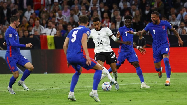 Jerman menjamu Inggris pada Grup 3A UEFA Nations League di Allianz Arena, Munich, Rabu (8/6/2022) dinihari WIB. REUTERS/Kai Pfaffenbach