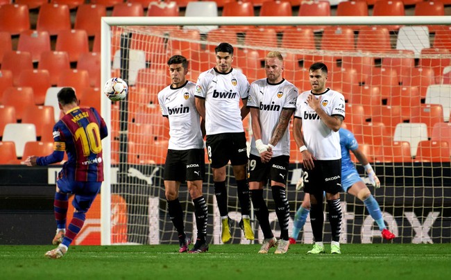 Terakhir Barcelona bikin gol lewat free kick adalah pada awal Mei 2021. Ketika itu Barca menang 3-2 atas Valencia, gol free kick dicetak Lionel Messi (Getty Images)