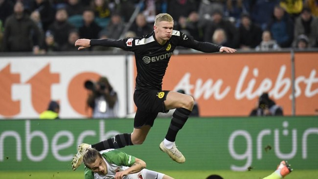 Ini aksi Erling Haaland ketika debut di Bundesliga bersama Dortmund di markas FC Augsburg pada 18 Januari 2020. Foto: Photo by THOMAS KIENZLE / AFP