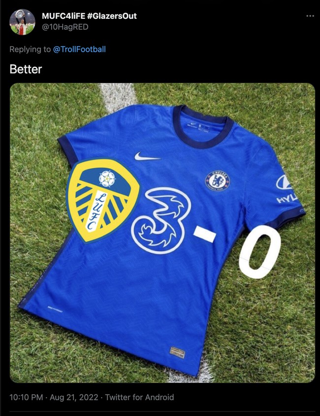 Chelsea tak berdaya di kandang Leeds dan kalah 0-3. Sponsor 3 di jersey Chelsea sampai ikut jadi bahan meme! Foto: dok. Twitter