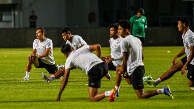 Sejumlah pesepak bola tim nasional Indonesia menjalani latihan di Stadion Gelora Bandung Lautan Api, Bandung, Jawa Barat, Jumat (23/9/2022).