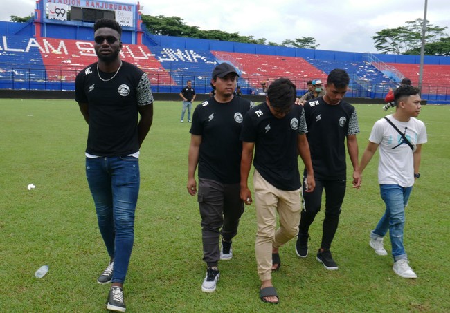 Para pemain dan ofisial Arema FC mendatangi Stadion Kanjuruhan, Senin (3/10/2022). (Dasril Roszandi/Getty Images)