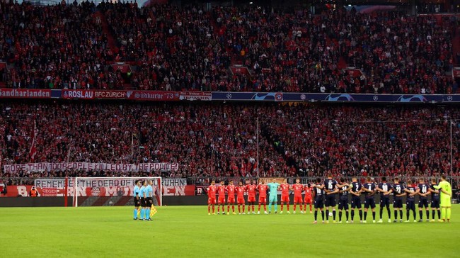 Para pemain, staf, ofisial dan fans mengambil bagian dalam mengheningkan cipta untuk mengenang para korban peristiwa tragis di Stadion Kanjuruhan di Indonesia sebelum pertandingan grup C Liga Champions UEFA antara FC Bayern München dan Viktoria Plzen di Allianz Arena, Munich, Jerman, Rabu (5/10/2022) dini hari WIB. Getty Images/Adam Pretty