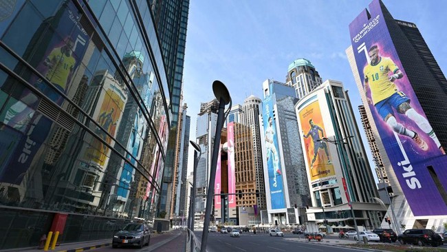 Qatar - Gelaran Piala Dunia 2022 di Qatar tinggal menghitung hari. Menjelang acara tersebut, gedung-gedung dihiasi gambar-gambar pemain sepakbola dunia.