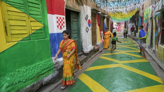 India - Sebuah pemukiman di Kolkata Utara dihias dengan tema Piala Dunia 2022. Sejumlah mural hingga foto para pemain dipajang untuk menyemarakkan Piala Dunia 2022.