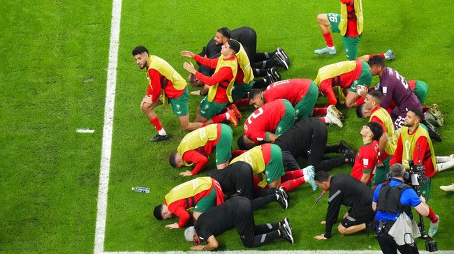 Qatar - Maroko sukses menyingkirkan Spanyol di babak 16 besar Piala Dunia 2022. Usai memastikan satu tiket ke perempatfinal, penggawa Maroko melakukan sujud syukur.
