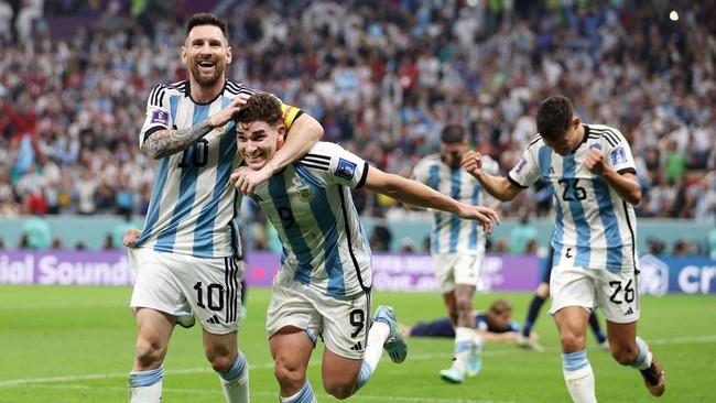 Qatar - Julian Alvarez tampil gemilang saat melibas Kroasia di semifinal. Ia dan Messi mampu bekerja sama dengan baik dan membawa Argentina ke final Piala Dunia 2022.