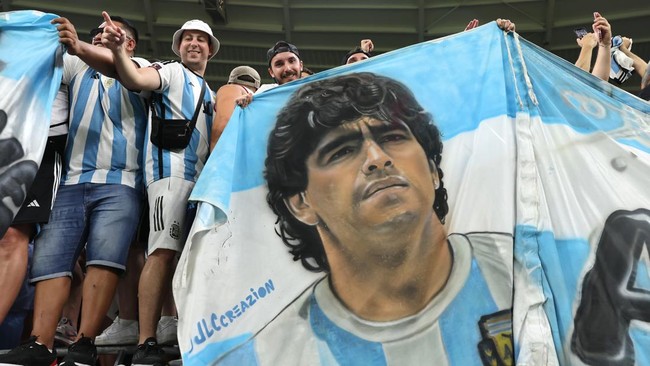 Doha - Atribut penghormatan mendiang Diego Maradoni memenuhi tribun Argentina sepanjang gelaran Piala Dunia 2022. Mulai dari kaus, spanduk, hingga topeng E El D10S.