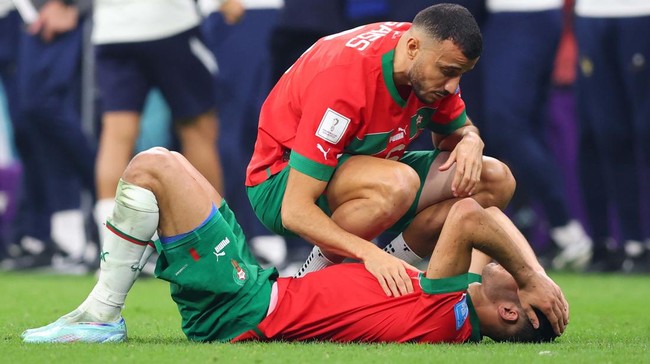 Qatar - Meski kalah di semifinal Piala Dunia 2022, kapten Timnas Maroko Romain Saiss tetap tagar usai laga. Dia bahkan menenangkan pasukannya yang bersedih.