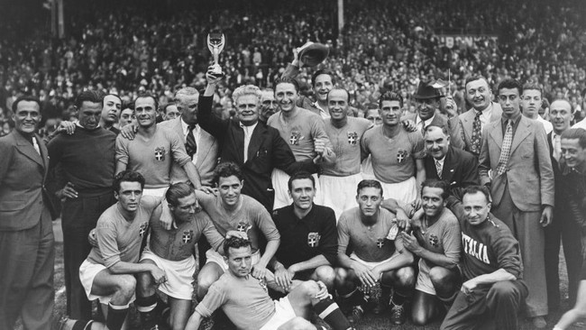 Vittorio Pozzo (memegang trofi, 1886-1968) mengantarkan Italia memenangi Piala Dunia 1934 dan 1938. Hingga saat ini, ia merupakan satu-satunya pelatih yang pernah dua kali menjadi juara dunia. Foto: Gamma-Keystone via Getty Images/Keystone-France