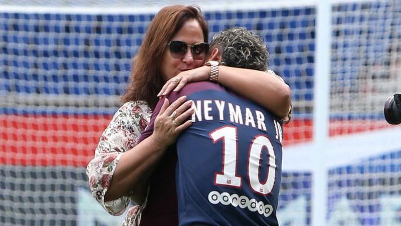 Neymar Jr memeluk ibunya Nadine Santos setelah penandatanganannya sebagai pemain baru Paris Saint-Germain di Parc des Princes, Paris, Prancis. (Jean Catuffe/Getty Images)