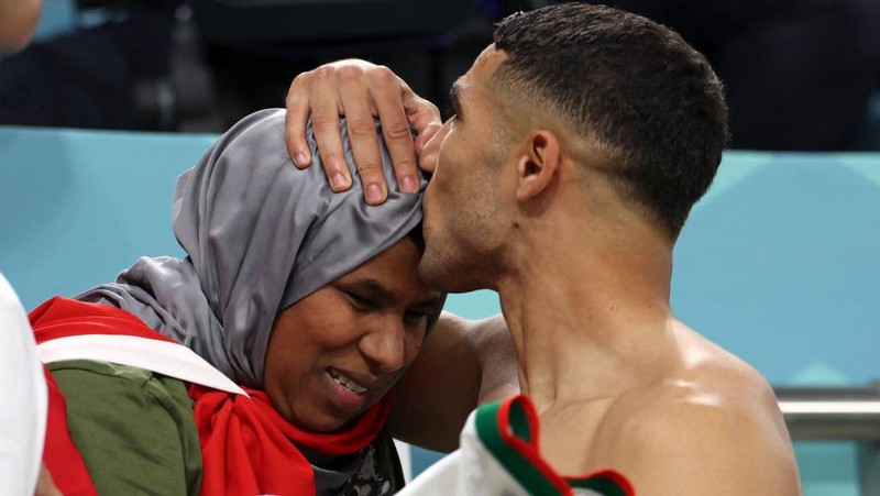 Achraf Hakimi disambut oleh ibunya pada akhir pertandingan sepak bola Grup F Piala Dunia 2022 Qatar antara Belgia dan Maroko di Stadion Al-Thumama di Doha. (Fedel Senna/AFP/Getty Images)