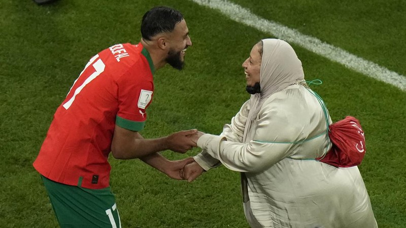 Sofiane Boufal merayakan dengan seorang ibu di lapangan setelah kemenangan timnya dalam pertandingan sepak bola perempat final Piala Dunia antara Maroko dan Portugal, di Stadion Al Thumama di Doha, Qatar. (AP Photo/Alessandra Tarantino)