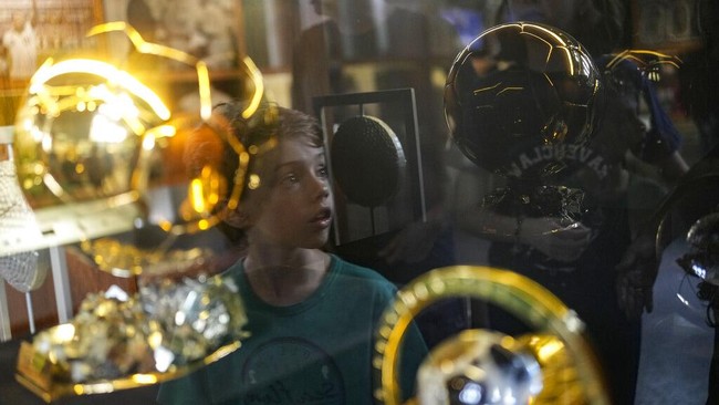 Seorang anak laki-laki terpantul di kotak kaca saat ia mengunjungi Pele Museum di Santos, Brasil, Senin (26/12/2022). Museum Pele secara resmi dibuka pada 15 Juni 2014. AP/Matias Delacroix