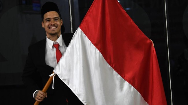 Pesepak bola Shayne Pattynama berpose dengan bendera Merah Putih usai pembacaan sumpah menjadi Warga Negara Indonesia (WNI) di Jakarta, Selasa (24/1/2023).
