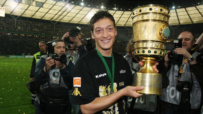 DFB-Pokal merupakan trofi pertama yang ia raih dalam karier seniornya. Ia memenanginya pada 2009 bersama Werder Bremen usai mengalahkan Bayer Leverkusen 1-0 di final. Oezil mencetak gol kemenangan. Foto: Corbis via Getty Images/sampics