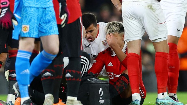 Jakarta - Dua pemain Sevilla dengan sigap bantu memapah bek Manchester United Lisandro Martinez yang tampaknya mengalami cedera cukup parah. Begini momennya.