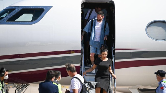 Lionel Messi bersama dengan Timnas Argentina telah mendarat di bandara Beijing menggunakan jet pribadi, Sabtu (10/6) Foto: VCG via Getty Images/VCG