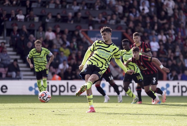 Kai Havertz ditugasi menjadi algojo ketika Arsenal mendapat tendangan penalti melawan Bournemouth. The Gunners sudah dalam posisi unggul 2-0. Foto: AP/Robbie Stephenson
