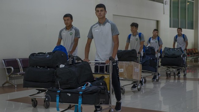 Boyolali - Pesepakbola Tim Nasional Uzbekistan U-17 tiba di Bandara Adi Soemarmo, Boyolali. Timnas Uzbekistan U-17 akan bertanding pada grup B Piala Dunia U-17.