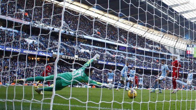 Trent Alexander-Arnold menjebol gawang Man City di menit ke-80, membuat Liverpool berhasil menyamakan skor. Foto: Action Images via Reuters/JASON CAIRNDUFF