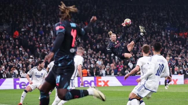 Jakarta - Striker Manchester City Erling Haaland unjuk aksi akrobatik saat menendang bola dengan cara salto saat melawan FC Copenhagen. Begini momen salto keren tersebut.