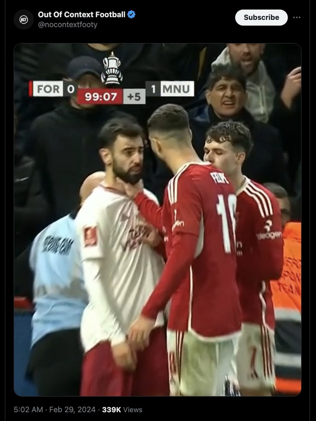 Ini adalah momen Felipe mencekik Bruno Fernandes di partai Piala FA ketika Nottingham Forest menjamu Manchester United. Foto: dok. Internet/X (Twitter)
