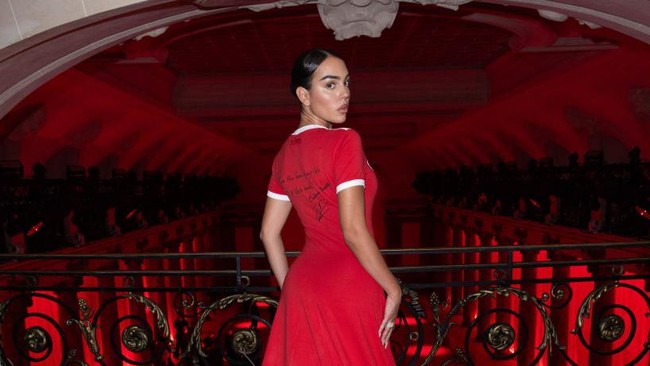 Jakarta - Georgina Rodriguez berlenggak-lenggok memakai gaun yang sarat dengan nuansa warna merah. Ada "Ronaldo" di dadanya.