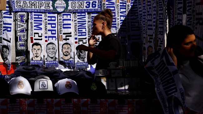 Madrid - Real Madrid resmi mengumumkan kedatangan Kylian Mbappe. Syal bergambar Kylian Mbappe telah dijual di luar stadion Santiago Bernabeu.