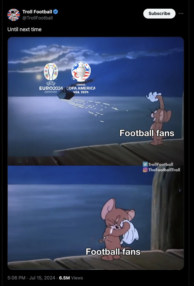 Jakarta - Selesainya Euro 2024 dan Copa America bikin fans bola bersedih, memunculkan beragam meme. Tambah ramai karena langsung ada kekalahan Manchester United.
