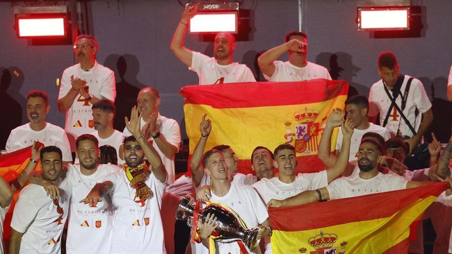 Spanyol - Lautan manusia memenuhi Plaza Cibeles, Kota Madrid, Spanyol. Mereka ikut dalam parade Timnas Spanyol yang menjadi juara Piala Eropa 2024.