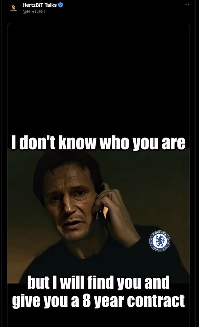 Aksi belanja Chelsea, plus kebiasaan memberi kontrak panjang ke pemain, diledek lewat meme ini. Foto: dok. Internet/X (Twitter)