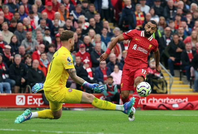 Mohamed Salah bikin gol saat Liverpool menang 2-0 atas tamunya Brentford di pekan kedua Liga Inggris, Minggu (25/8) malam WIB (Reuters)