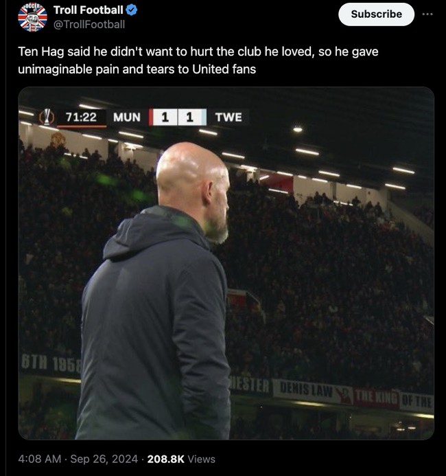 Pernah main di Twente, Erik ten Hag bilang "enggan menyakiti" klub Belanda itu. Dan ternyata ia memang gagal membawa MU meraih poin maksimal. Foto: dok. Internet/X (Twitter)