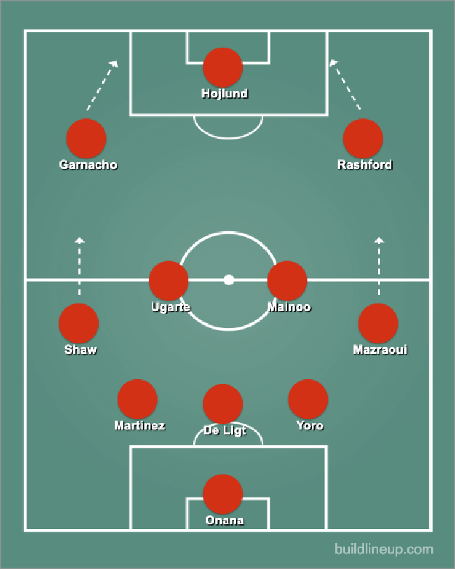 Amorim rutin memainkan 3-4-3 dengan kedua wing back bantu meng-overload lini depan. Di tengah ada dobel pivot. Andaikata semua pemain MU fit, mungkin begini skemanya. Foto: Dok. Build Line Up