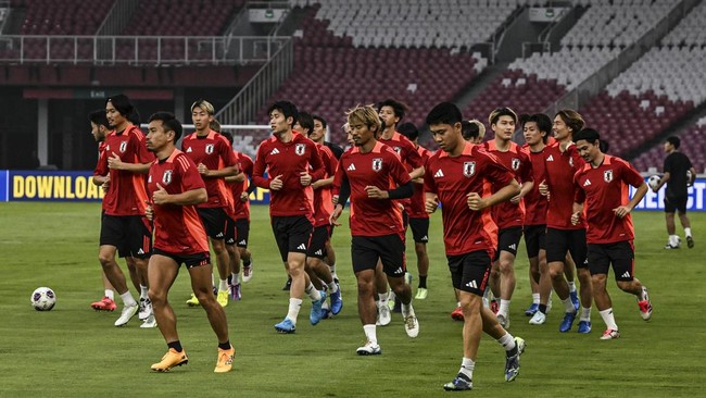 Jakarta - Timnas Jepang akan hadapi Timnas Indonesia di laga Grup C Babak Ketiga Kualifikasi Piala Dunia 2026. Mereka berlatih di Stadion Utama Gelora Bung Karno, Jakarta