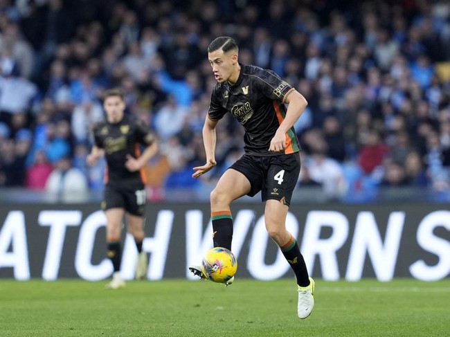 Bek Indonesia, Jay Idzes, dimainkan sebagai starter saat Venezia menyambangi Stadion Diego Armando Maradona, markas Napoli, Minggu (29/12/2024). (Foto: Matteo Ciambelli/DeFodi Images via Getty Images)