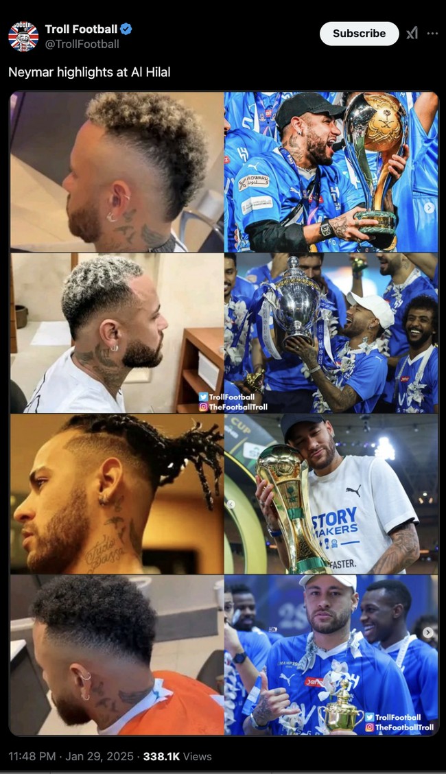 Meme aksi Neymar semasa di Al Hilal; lebih sering ganti gaya rambut ketimbang main bola, tapi rutin ikut angkat piala. Foto: dok. Internet/X (Twitter)