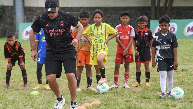 Jakarta - Cristian "El Loco" Gonzales memberikan pelatihan untuk bibit muda sepakbola Indonesia. Ia melatih passing, controlling, dribbling, hingga shooting.