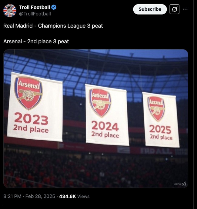 Real Madrid pernah berturut-turut juara Liga Champions. Kalau Arsenal on the way beruntun jadi runner-up Premier League nih. Foto: dok. Internet/X (Twitter)