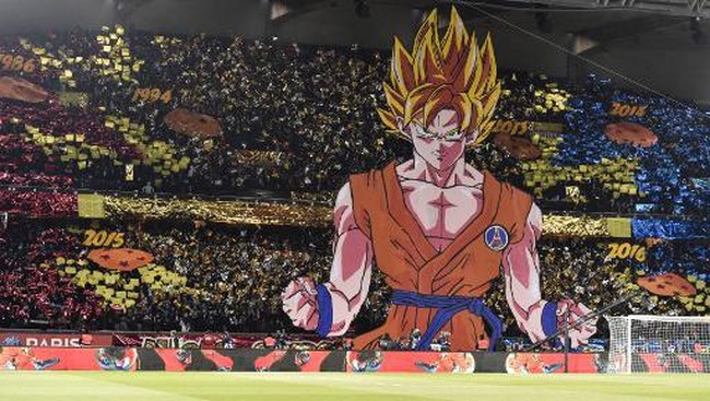 Pada tahun 2018, PSG pernah pamer tifo Goku-nya Dragon Ball. Ada enam bola naga menyertai, merujuk pada PSG yang ketika itu masih mengejar gelar ketujuh di Liga Prancis -- yang diraih di akhir musim. Foto: AFP/GERARD JULIEN