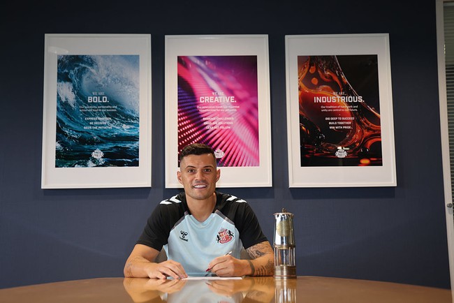 Granit Xhaka direkrut Sunderland dari Leverkusen di musim panas 2025 ini seharga 15 juta Euro atau setara Rp 282 miliar dan dikontrak selama tiga musim (Sunderland AFC via Getty Images/Ian Horrocks)