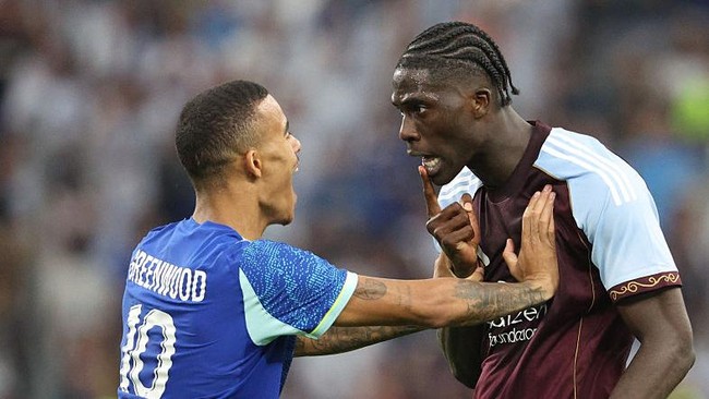 Awalnya, gelandang Villa Amadou Onana kesal usai sebuah pelanggaran dan menghardik Greenwood yang membela Marseille. Foto: Getty Images/Neal Simpson/Allstar