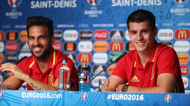 Ini adalah momen Alvaro Morata dan Cesc Fabregas menjalani sesi jumpa pers di Euro 2016. Keduanya adalah penggawa Tim Matador Spanyol. Foto: Getty Images/Handout