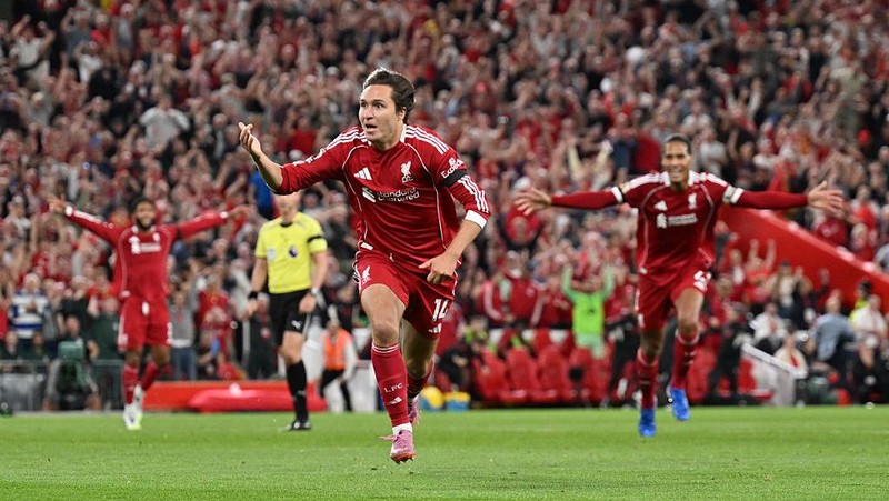 Pada 26 Agustus di Premier League, Liverpool masih berimbang 2-2 melawan Newcastle. Rio Ngumoha lantas jadi penentu kemenangan 3-2 lewat golnya di menit ke-90+10. Foto: Getty Images/George Wood
